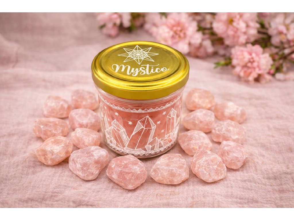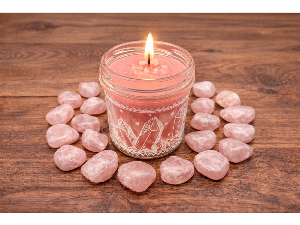 Uvnitř svíčky se ukrývá tromlovaný drahokam růženín 💎💗 – známý jako kámen lásky, srdce a vnitřní pohody. Růženín podporuje harmonii vztahů 🤍, jemnou ženskou energii ✨, sebelásku 💖 a uklidnění emocí 🌙.