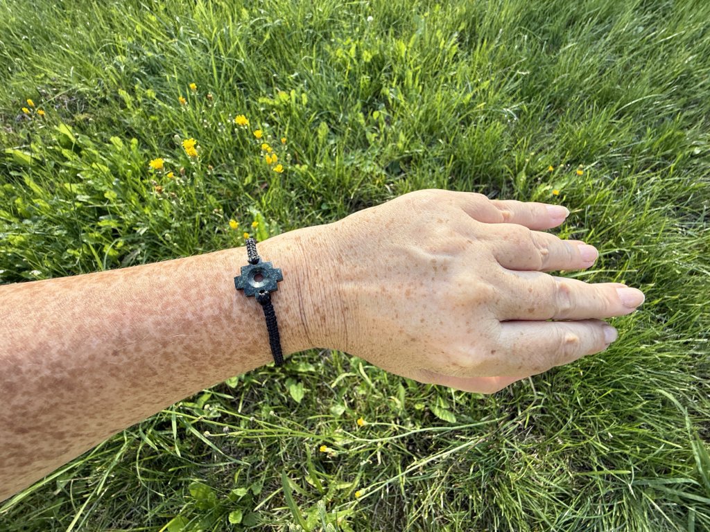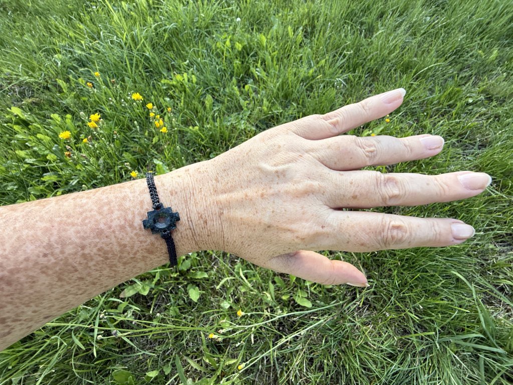 Šperk se snadno přizpůsobí na velikost ruky vzadu umístěným posuvným systémem. Náramek vyrobila ručně šikovná šperkařka Lucka z Prahy.