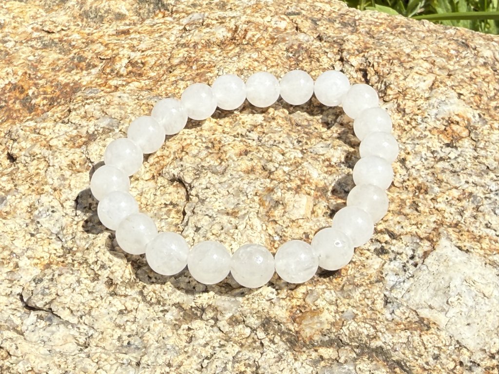 Šperk na ruku s jemným mléčným jadeitem s 8 mm širokými kuličkami tohoto pravého drahokamu nepřibarvovaného, co se snadno přizpůsobí na velikost ruky díky elasticitě gumičky.