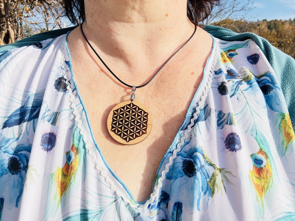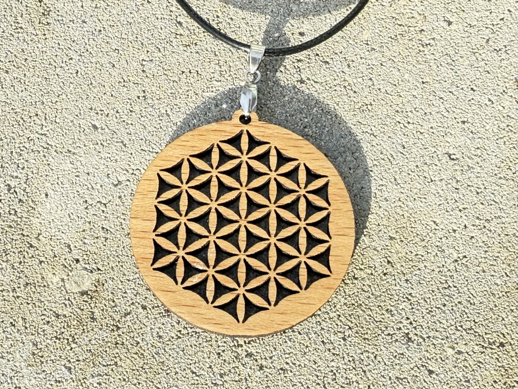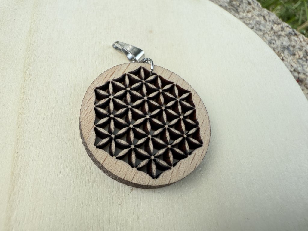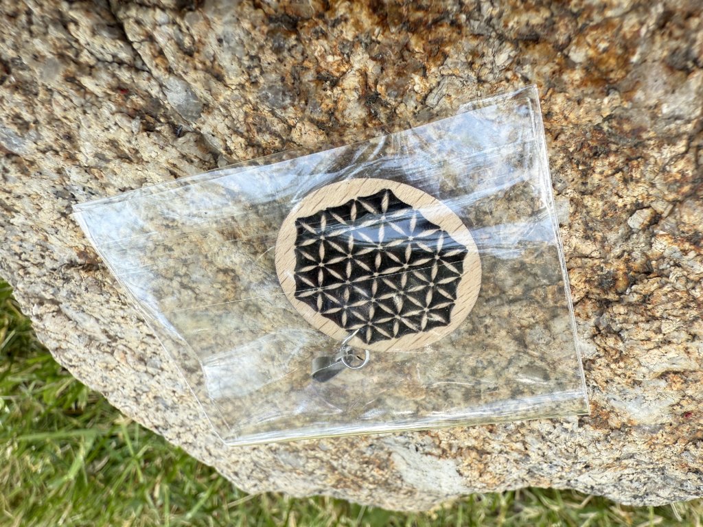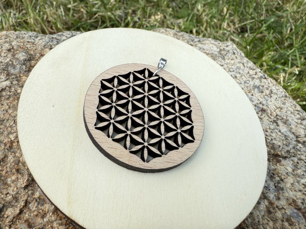 Dřevěný amulet s mocným symbolem posvátné geometrie z přírodního materiálu vyrobený českou firmou. Velice precizně vygravírovaný vzor je skrze průhledný na kůži, což vytváří zajímavý efekt. Praktický stříbřitý úchyt je určen na provlečení šňůrky, řetízku nebo kůžičky (není součástí výrobku).