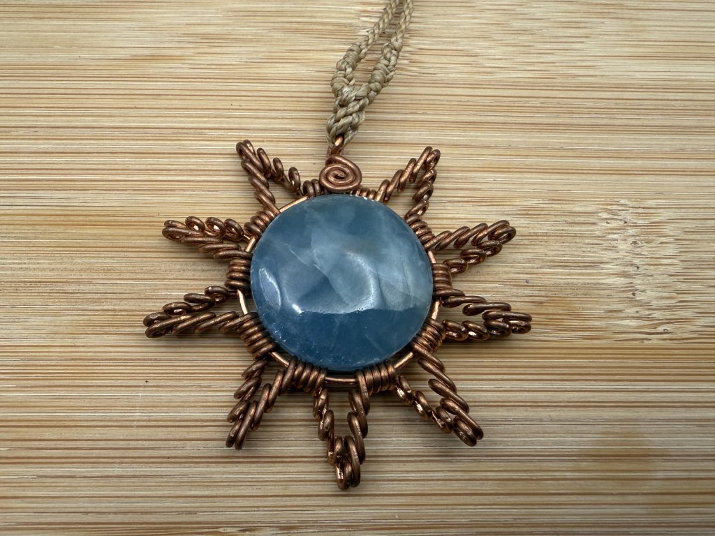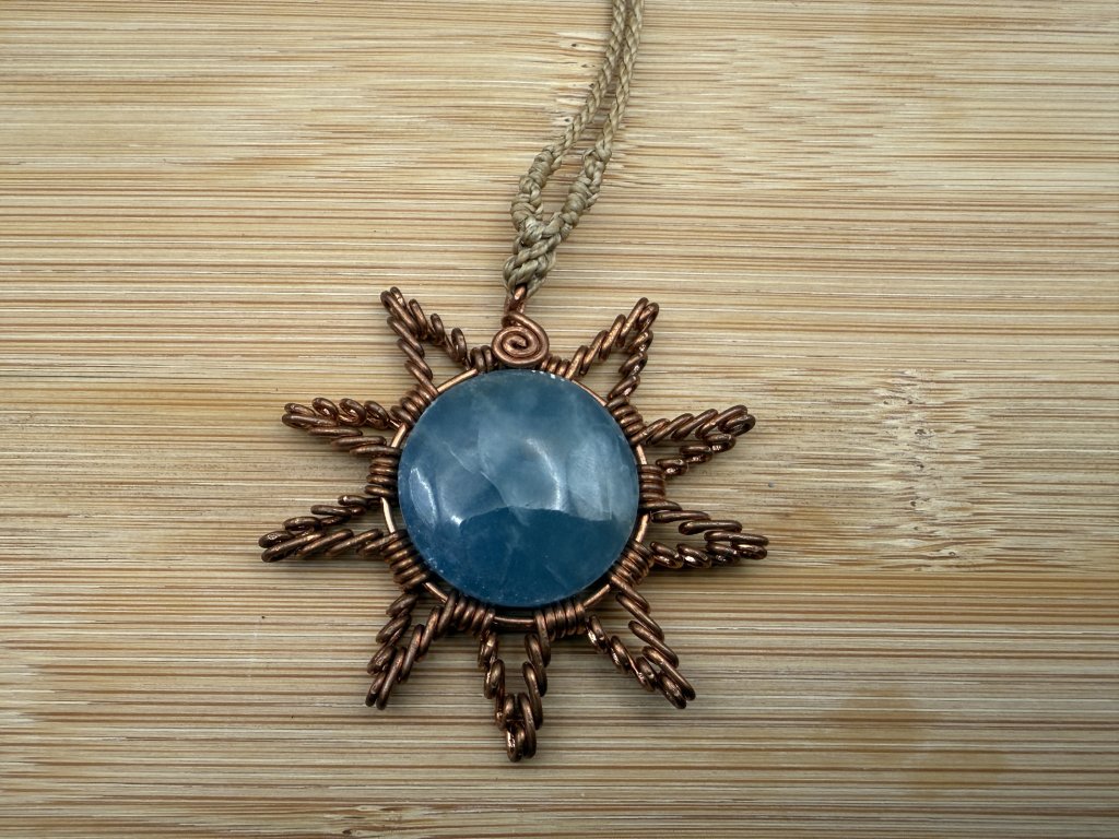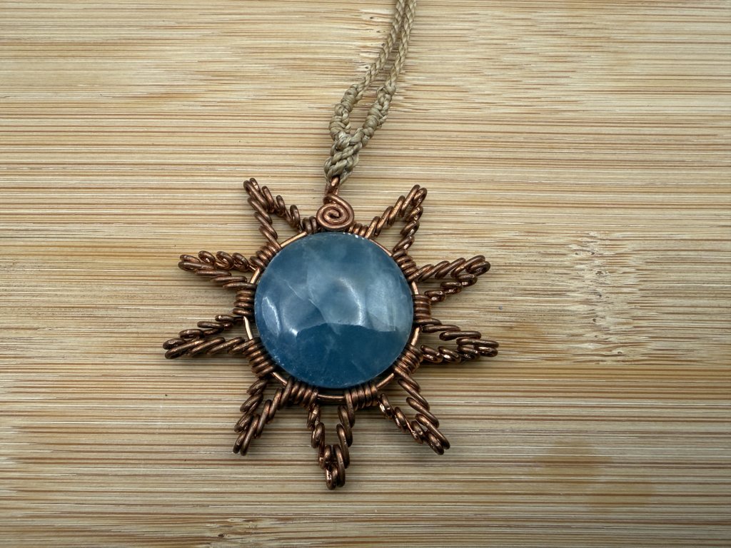 Tento jedinečný talisman inspirovaný bohem Slunce Inti, uctívaným starověkými civilizacemi And, je symbolem života, světla a duchovní síly. Ručně tepané sluneční paprsky z měděného drátu obepínají zářivý kámen modrého opálu, jenž působí jako kapka nebeského světla zachycená v mědi.